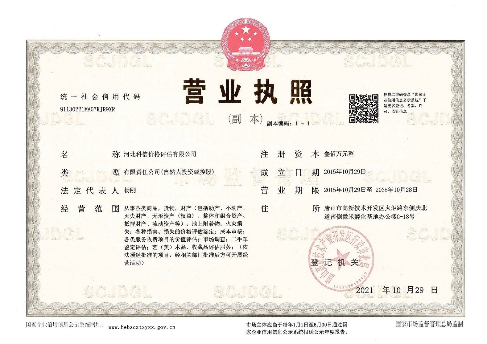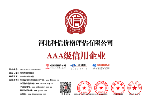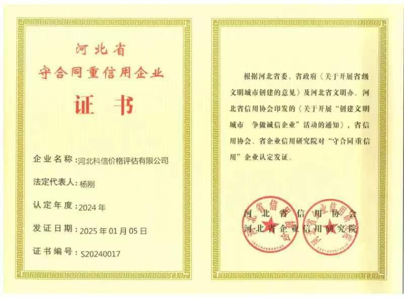 河北科信價格評估有限公司為"AAA"級信用企業,具有商務部、文化部備案,頒發相關鑒定與專業評估資質,由河北省價格評估行業協會頒發的“甲級”《價格評估機構執業登記證書》。公司是河北省價格評估行業協會常務理事單位,河北省科技型中小企業,河北省政府中介超市入冊鑒定評估機構、唐山市政府中介超市入冊的鑒定評估機構、唐山仲裁委員會入冊鑒定評估機構。依法在唐山工商行政管理部門注冊登記的獨立第三方評估機構。公司成立于2015年,注冊資金300萬元人民幣,公司擁有多名價格鑒證師、價格評估專業人員、國家高級、中級機動車鑒定評估師、中級涉案財物評估師、汽車估損師、保險公估師、高級林業工程師等,為您提供專業優質的服務,公司嚴格按照程序組織實施鑒定評估以及合法的市場調查業務,所出具的價格評估報告書、意見書具有法律效力并為國家認可。公司自成立以來共接受河北省交警系統、法院系統、檢察院系統、交通局系統、財政系統、銀行系統以及社會各界人士的各類委托3000余件,受到一致好評。在執業過程中,我們將依照相關的法律、法規,嚴格遵循客觀、獨立、公正、公平、科學性的原則;竭誠為您提供專業、權威的價格評估服務和信息咨詢服務;為您提供專業、快捷的優質服務。